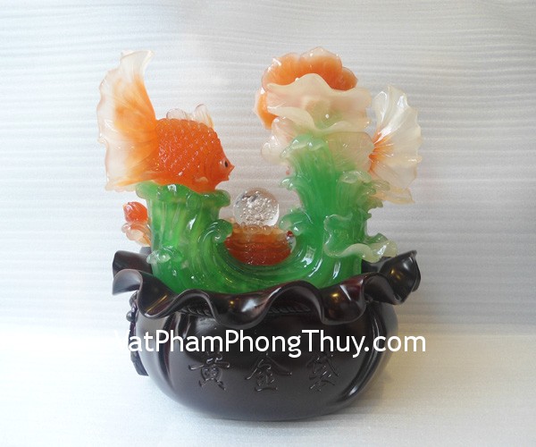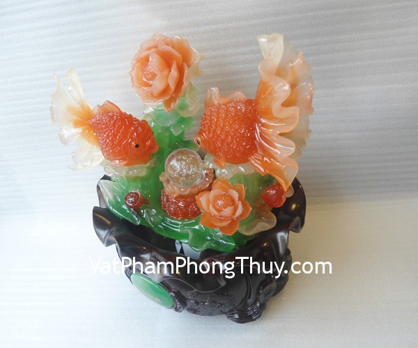 + Chất liệu và hoàn thiện: Tượng song chép, phong thủy luân bột đá màu (tại Việt Nam).