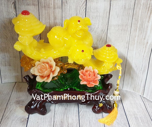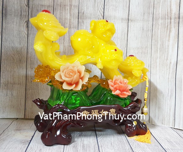 + Chất liệu và hoàn thiện: Tượng song tiên heo vàng ngọc, trên như ý vàng mẫu đơn đỏ, bột đá màu cao cấp (tại Việt Nam).