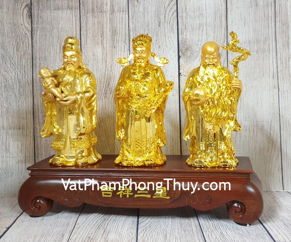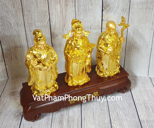 + Chất liệu và hoàn thiện: Tam đa phước lộc thọ vàng bóng trên đế gỗ, hàng bột đá mạ vàng (tại Việt Nam)
