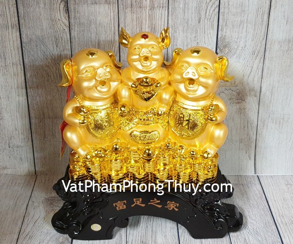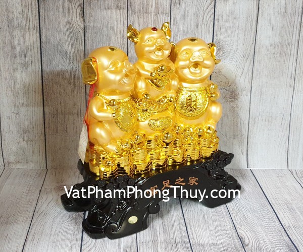+ Chất liệu và hoàn thiện: Tượng tam tiên heo vàng trên đống tiền vàng đế gỗ, bột đá mạ vàng cao cấp (tại Việt Nam).