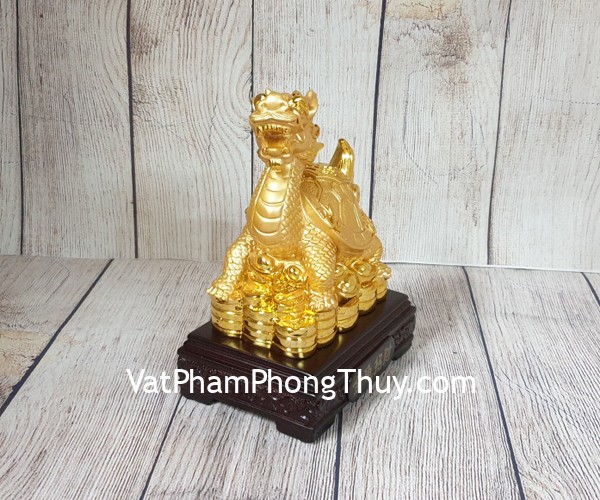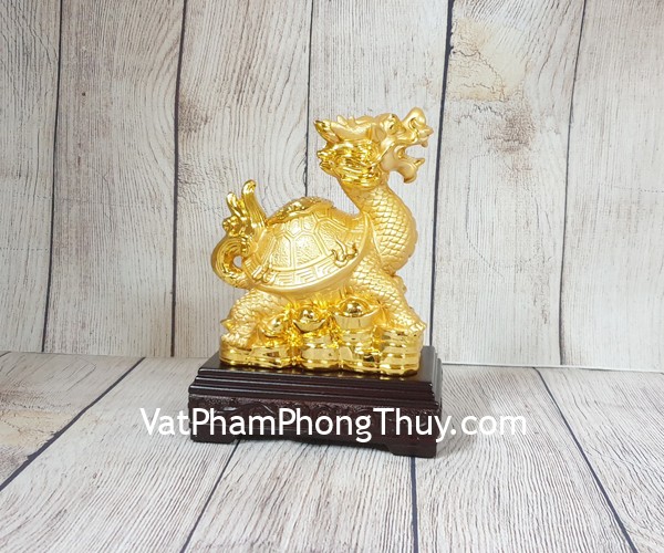 + Chất liệu và hoàn thiện: Tượng long quy (rùa đầu rồng) vàng mai cõng bát quái, đứng trên đống tiền vàng, bột đá mạ vàng cao cấp (tại Việt Nam).