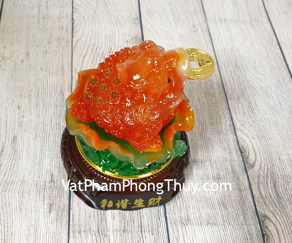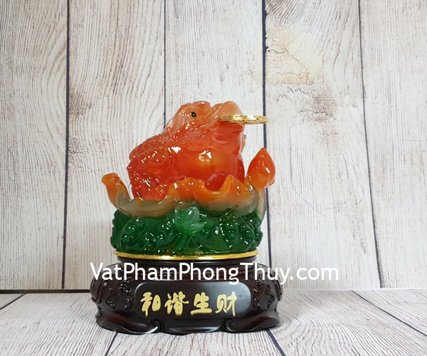 + Chất liệu và hoàn thiện: Thiềm thừ đỏ ngọc trên bụi sen xanh đế gỗ xoay, bột đá màu cao cấp (tại Việt Nam).