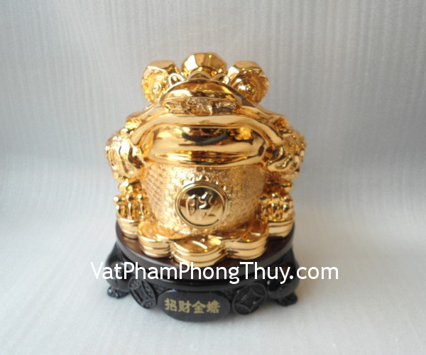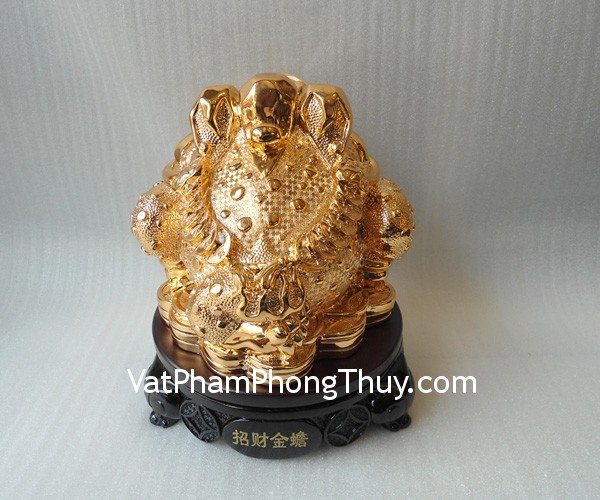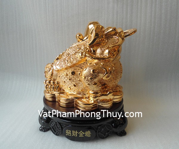 + Chất liệu và hoàn thiện: Thiềm thừ (cóc ba chân) đế gỗ xoay, bột đá mạ vàng non (tại Việt Nam).