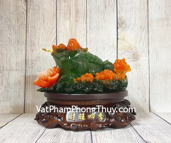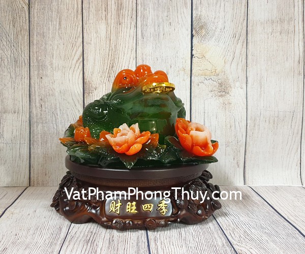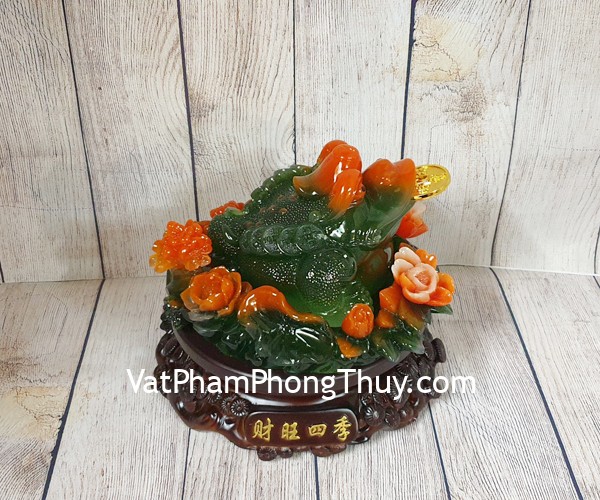 + Chất liệu và hoàn thiện: Thiềm thừ xanh ngọc đa sắc trên bụi mẫu đơn đỏ đế gỗ xoay, bột đá màu cao cấp (tại Việt Nam).