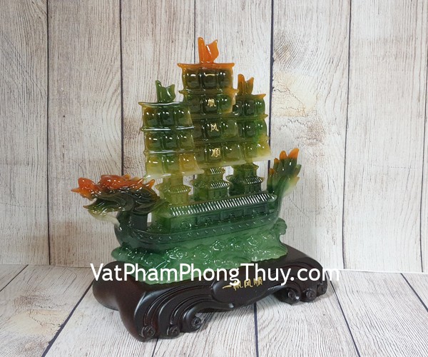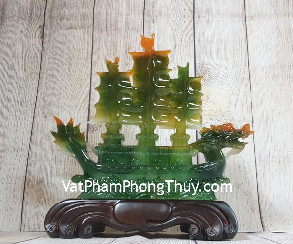 + Chất liệu và hoàn thiện: Thuyền buồm đầu rồng xanh ngọc đa sắc lướt sóng xanh, trên đế gỗ, hàng bột đá màu cao cấp (tại Việt Nam).