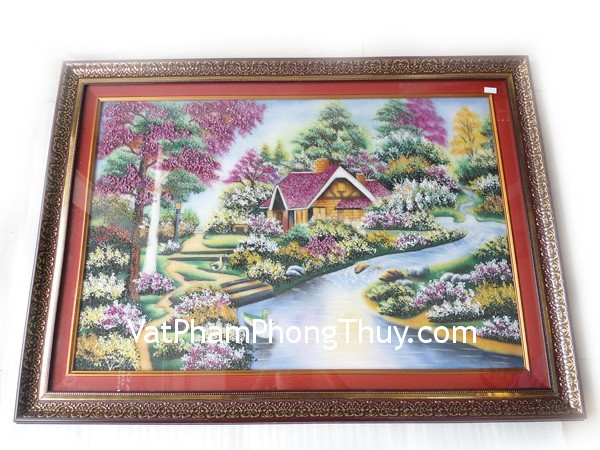 + Chất liệu và hoàn thiện : Tranh phong cảnh ngôi nhà bên sông – Tranh đá quý Lục Yên