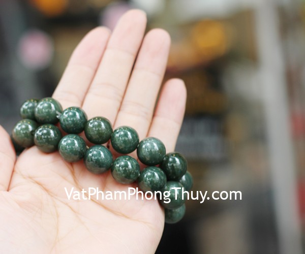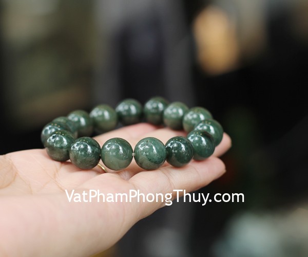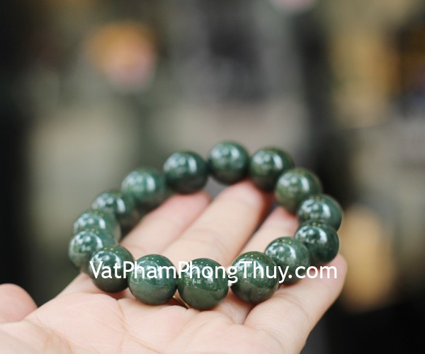+ Chất liệu và hoàn thiện: Chuỗi đeo tay ngọc Phỉ Thúy vân xanh đậm cỡ lớn (tại Việt Nam).