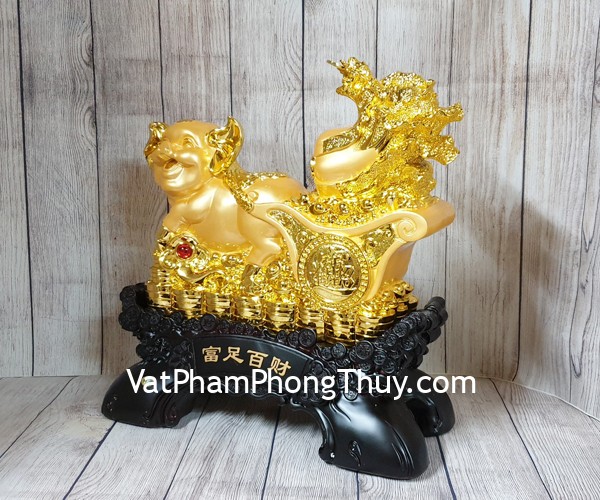 + Chất liệu và hoàn thiện: Tượng vua heo vàng kéo xe bắp cải tiền vàng, bột đá mạ vàng cao cấp (tại Việt Nam).
