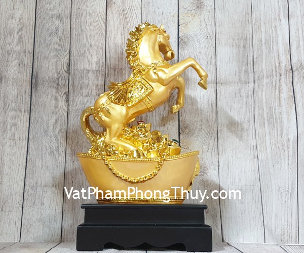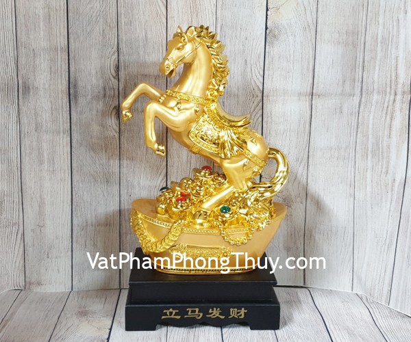 + Chất liệu và hoàn thiện: Tượng ngựa vàng đứng trên kim nguyên bảo, có đế gỗ, hàng bột đá mạ vàng cao cấp (tại Việt Nam).