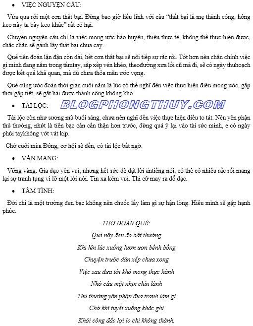 Điều tối cần, được xem rất quan trọng, đó là sự linh ứng của quẻ. Quẻ sở dĩ linh ứng hay không là do ở đức tin, phải thành tâm tin tưởng, quẻ mới linh ứng. Bất luận về vấn đề gì, bạn thành tâm khấn nguyện, sẽ thấy sự linh ứng bất ngờ của quẻ nầy.