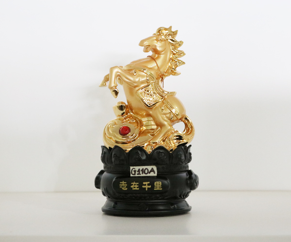 Tượng ngựa vàng trên đế gỗ tròn G110A là biểu tượng của sự kiên nhẫn, bền bỉ, lâu dài, là con vật mang lại sự may mắn, tài lộc, giúp mệnh chủ đạt kết quả cao hơn mong muốn. Ngựa kèm hồ lô còn đem lại bình an, hóa giải vận rủi cho người sử dụng.