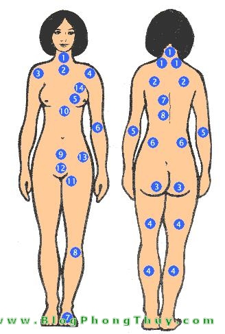 Thông thường ai cũng có nốt ruồi . Nốt ruồi có màu vàng lạt hay màu nâu v.v. Nốt ruồi phải thật đen hoặc thật đỏ mới tốt . Nốt ruồi đỏ còn gọi là nốt ruồi son. Sau đây là vị trí và ý nghĩa của một số nốt ruồi trên cơ thể phụ nữ (mặt trước) để các bạn tham khảo.